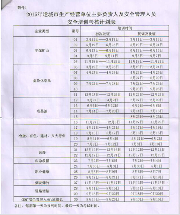 2015年运城市生产经营单位主要负责人及安全管理人员安全培训考核计划表