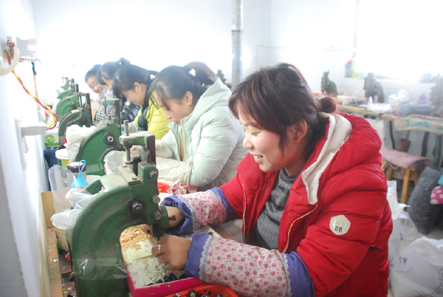 新元电子厂是返乡青年李康杰在南关村创办的,十年前,他在浙江温洲电子厂打工,2015年与厂商联营,在我县办起新元电子厂,招聘200多名留守妇女、闲散劳力进厂就业,每人每月收入1500多元。图为瑶峰镇新元电子厂员工正在为浙江温洲一家企业铆合组装电子产品。