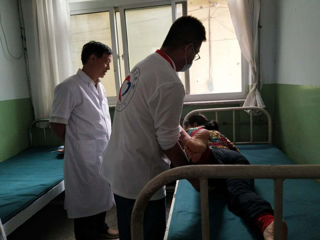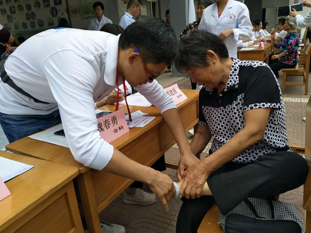 来自房山区第一医院的魏春勇医生检查病人脚部痛处