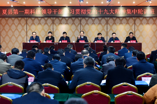 县委书记张宏志以“在学懂弄通做实上下功夫,争当践行党的十九大精神的先锋表率”为主题,围绕“进一步明确党的十九大主题和重大意义;进一步明确党的十九大精神的核心要义;进一步明确走进新时代,夏县应该怎么干、路子怎么走、工作怎么抓;进一步明确全面从严治党的重大任务”四个方面,对党的十九大精神进行了深入的辅导学习,全面深入分析了我县面临的形势,安排部署了我县当前和今后的主要工作。